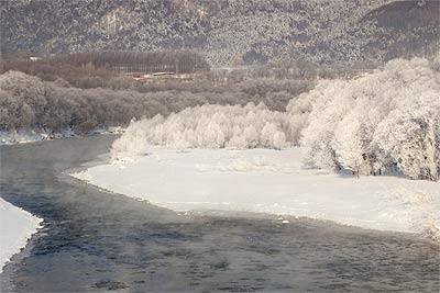 富良野までやってくると、空知川の川面から川霧が立ち上り、河畔林を真っ白に凍りつかせていた。 冬ならでは風景を眺めながらのドライブは楽しいが、路面がツルツルで思うようにスピードを出せない。 |