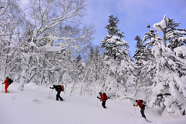 私たちは、二十二林班沢川の方へ滑り降りた方が雪が良いとの情報を得ていたので、そこから西斜面を滑ることにした。