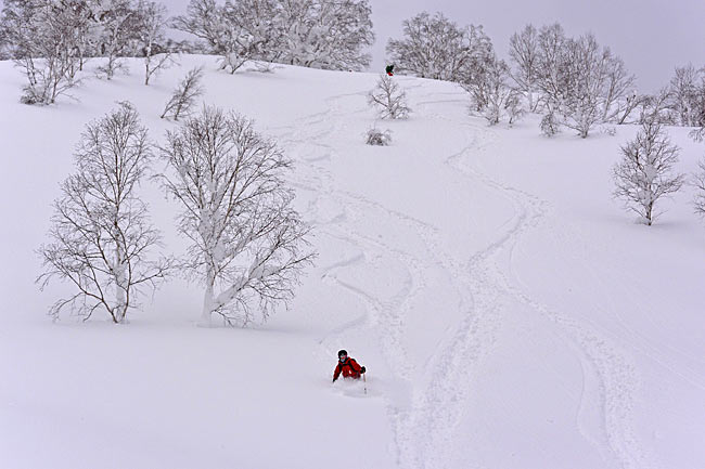 結構な急斜面だけれど、深くてしかもやや重たい雪質でスピードが全然でない。