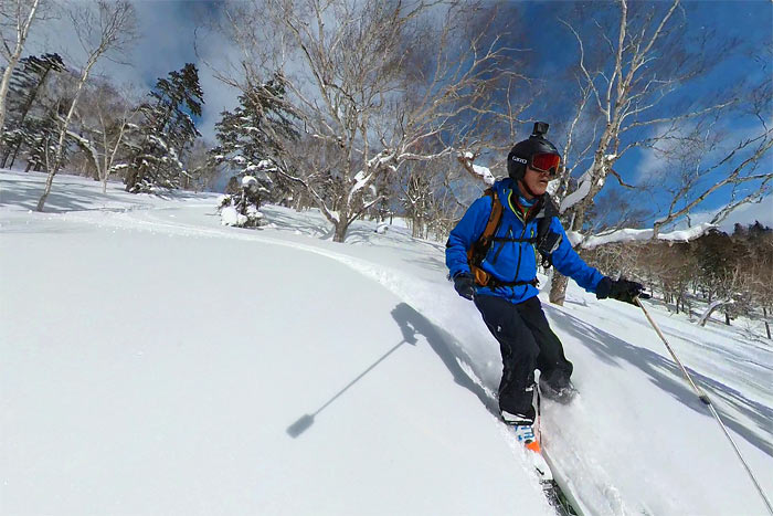 そのまま沢沿いに車まで滑ることもできたが、もう少しだけ滑りを楽しみたかったので、尾根の上まで登り返して、ダケカンバの疎林を滑り降りる。