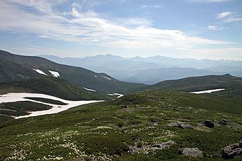 最後のピークの手前で登山道を離れ、南側のガレ場の方に入ると風の当たらない場所があったので、そこで最初の休憩をとる。 今日は、天気は良いものの、昨日よりも雲が多く、日高山脈の姿は昨日よりも霞んでしまっていた。 |