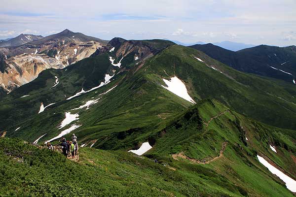 | 富良野岳を下る途中、三峰山への縦走路が見えている |